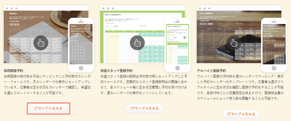 予約システムの紹介ページからもテンプレートを選んで作成できます。