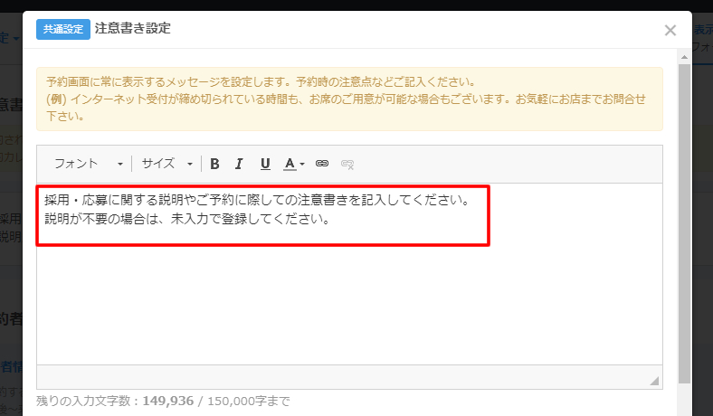 「採用・応募に関する説明やご予約に際しての注意書きを記入してください。・・・」というメッセージが仮で登録されていますので