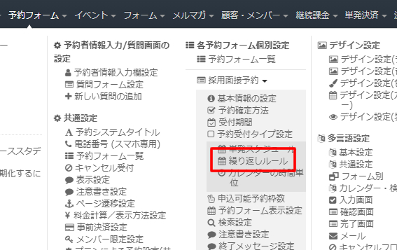 ヘッダーメニューの「予約フォーム」⇒「各予約フォーム個別設定」の「繰り返しルール」をクリックします。