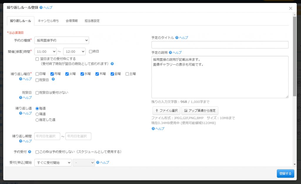 ある程度決まったスケジュールで作成する場合は、繰り返しルールから受付枠を登録します。