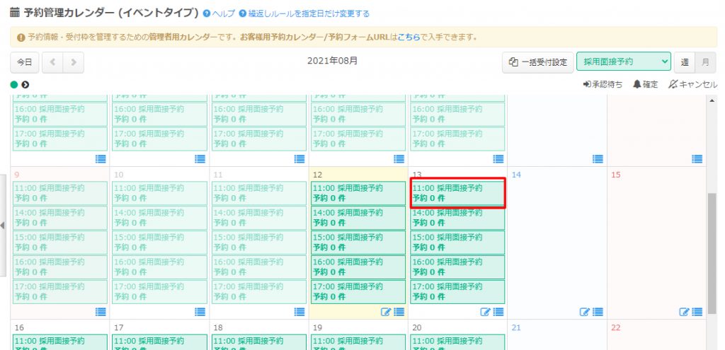 予約管理用のカレンダーが表示されます。