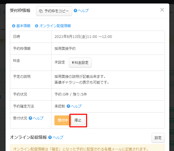 受付状況の「停止」ボタンをクリックするとこの枠の受付が停止されます。