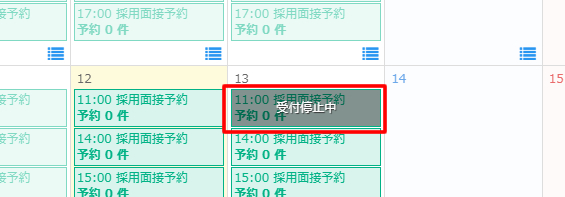 予約管理カレンダーには指定枠が「受付停止中」の表示に切り替わります。
