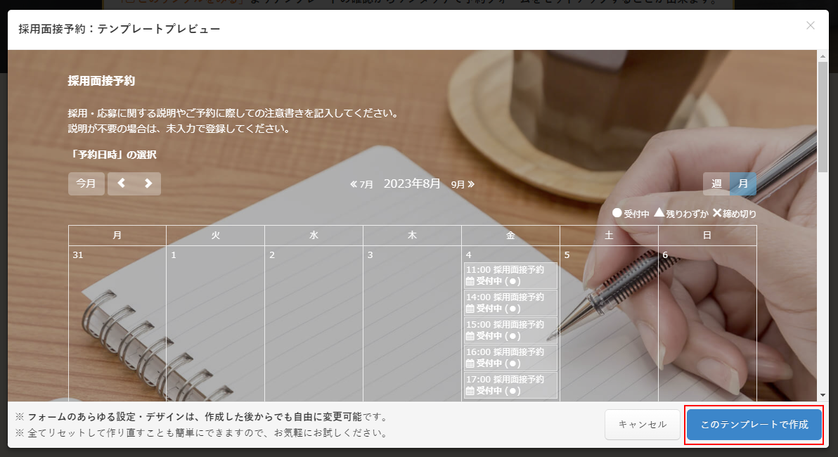「テンプレートプレビュー」で予約フォームを確認することができます。