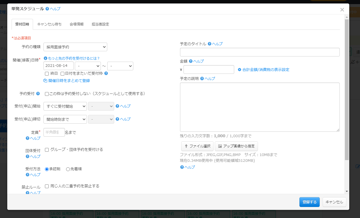 その日時限りの受付枠を登録したい場合は「単発スケジュール」を使用します。