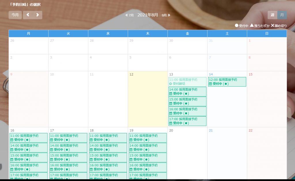 この記事でご紹介する採用面接・スタッフ登録説明会予約テンプレートは以下になります。予約カレンダーの表示や予約受付の流れを確認頂けます。テスト予約しても問題ありませんのでぜひ実際の挙動をご確認ください。