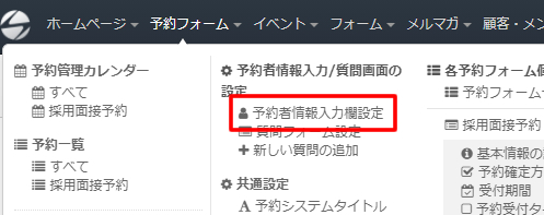 ページ上部「予約フォーム」⇒「予約者情報入力設定」をクリックします。