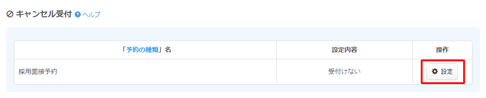 キャンセル受付設定エリアからキャンセル受付を設定するフォームの設定ボタンをクリックします。