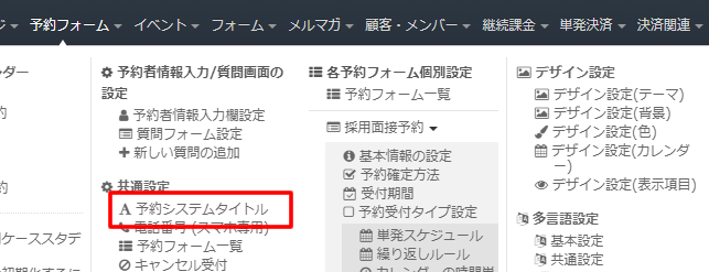 まずタイトル設定は上部メニューの「予約フォーム」→「共通設定/予約システムタイトル」をクリックして移動します。