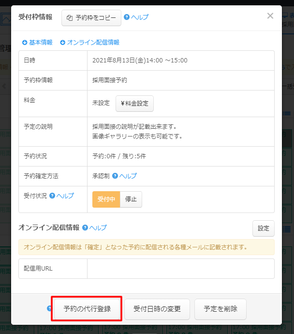 「予約の代行登録」ボタンをクリックします。