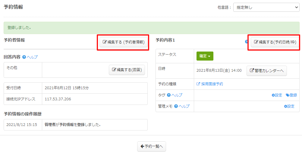 予約者情報詳細画面が表示されますので、登録された情報が反映されているか確認しましょう。