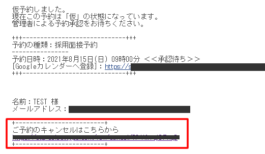 全てのお客様にしますと、予約の控えメールや確定メールにキャンセル受付用のリンクが設置されます。