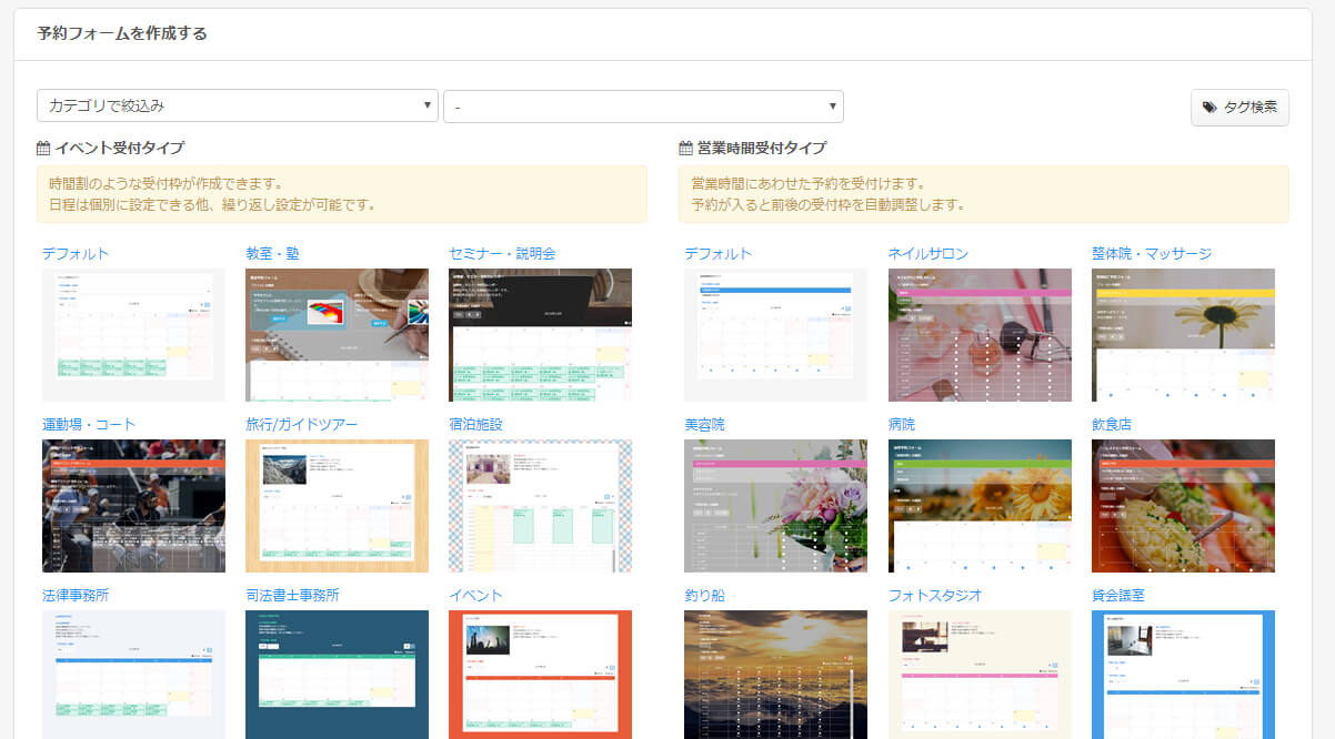 予約システムの紹介ページからもテンプレートを選んで作成できます。
