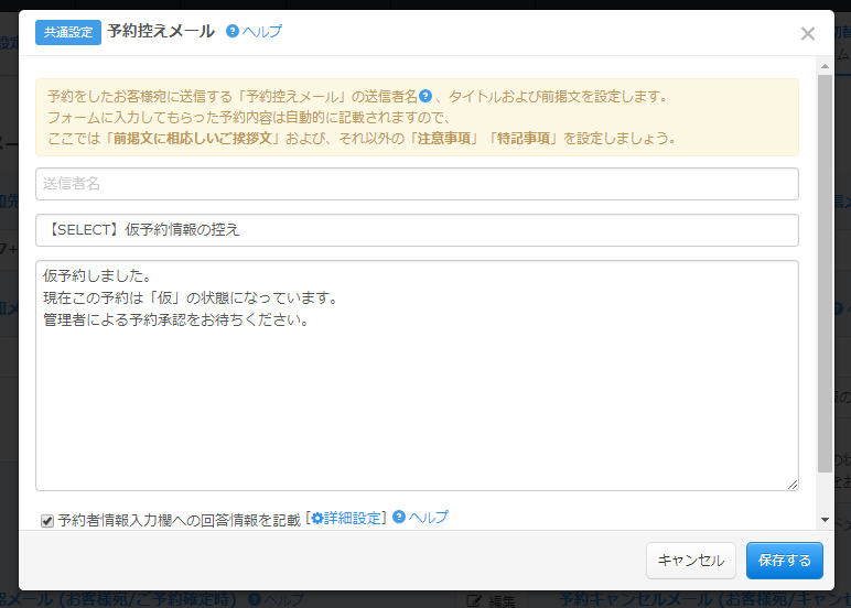 お客様に通知されるこちらのメールの件名や予約情報の前に記載される文章は、オリジナルの内容に変更できますので、お店の名前やサービスにあわせた内容に変更しましょう。
