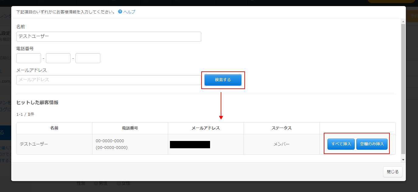 ヒットした顧客情報から「すべて挿入」をクリックすると、顧客リストに登録された情報が各入力欄に記入された状態になります。