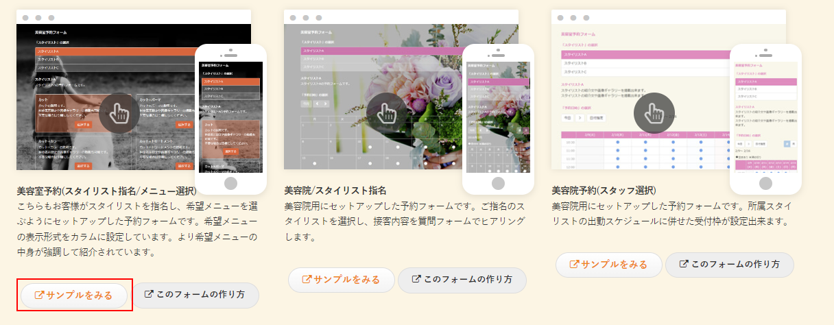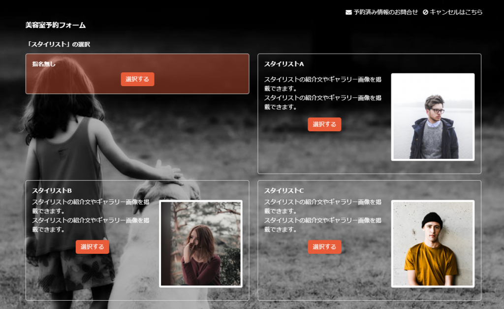 今回のサンプルは美容室のスタイリスト毎に予約フォームを作成し、お客様にはスタイリストを選んでからスケジュールを確認してもらうようにします。