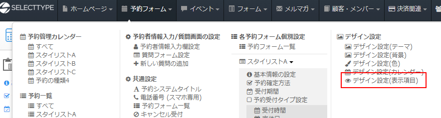 上部ヘッダーより「予約フォーム」→”デザイン設定”内の「デザイン設定(表示項目)」とクリックします。