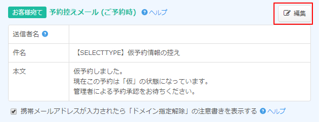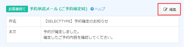 「予約控えメール (お客様宛/ご予約時)」の「編集」ボタンをクリックして設定フォームを表示します