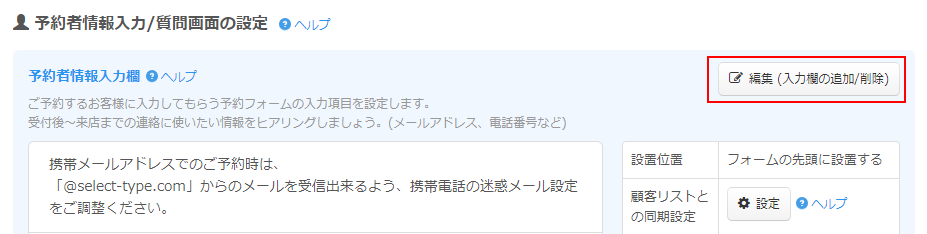 予約者情報入力欄の設定ではご希望の項目がない場合や、お客様情報の他にもご予約の際にヒアリングしたい内容を質問設定機能で設定します。