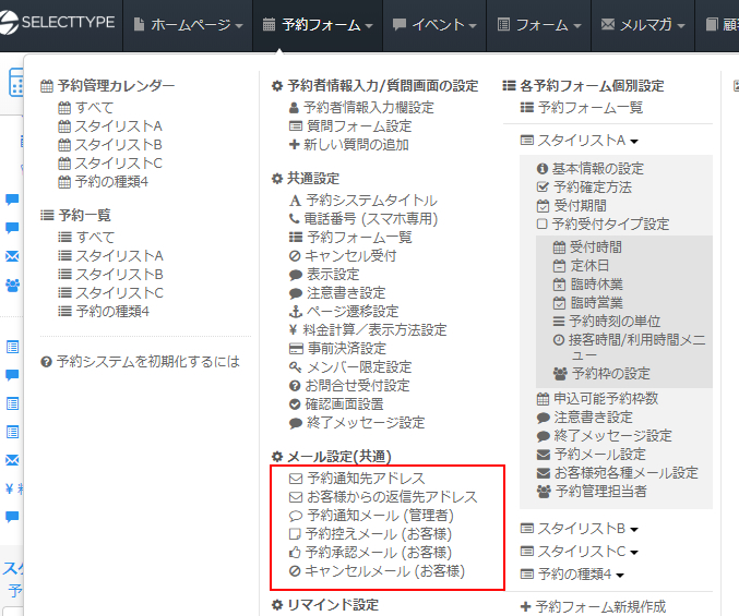 SELECTTYPEから予約に関するメールの設定は「予約メール設定」にて各種設定が行えます。