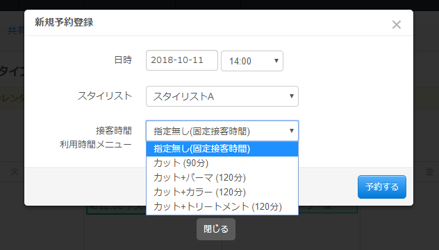 メニューには施術時間の設定が可能で、設定された時間分予約枠が消費されるようになります。