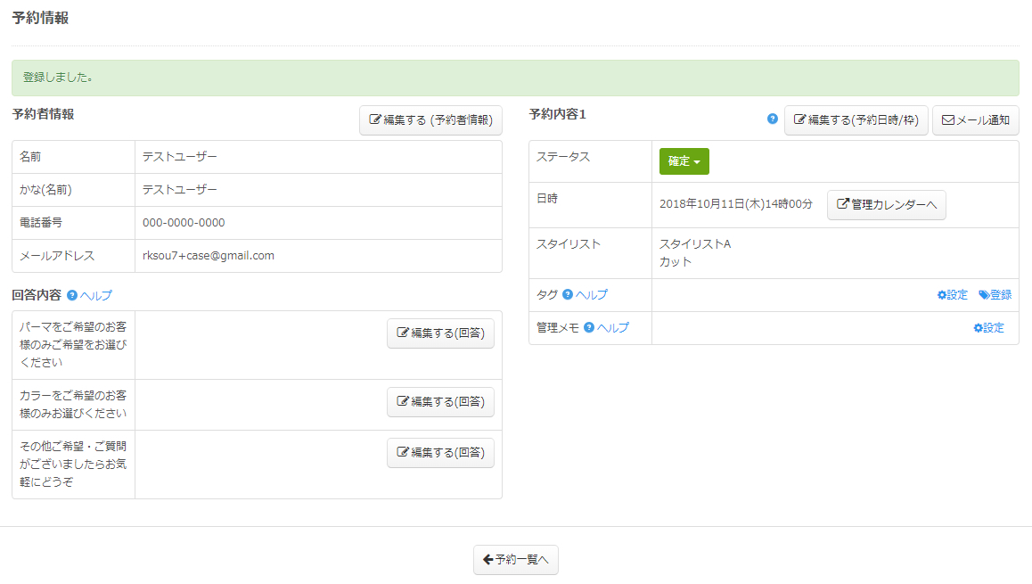 登録が完了すると、登録した予約情報の詳細画面が表示されます。