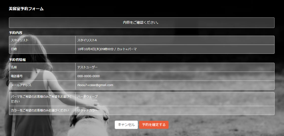 予約の内容、予約者の情報に問題がなければ確定し送信します。