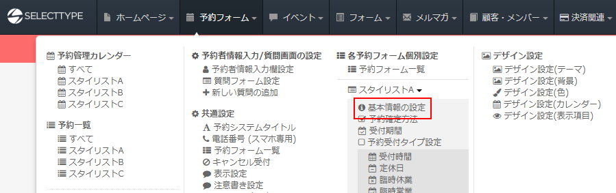 ヘッダーメニューの「予約フォーム」⇒「各予約フォーム個別設定」の「基本情報の設定」をクリックします。