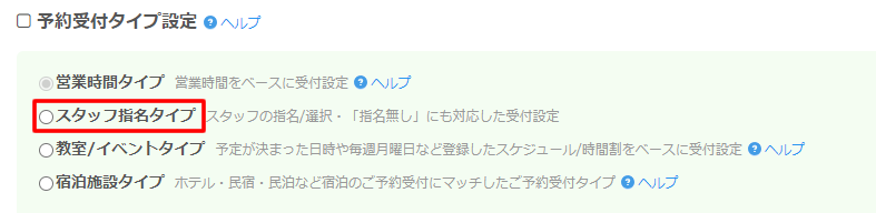 予約受付タイプ設定が表示されますので、「スタッフ指名タイプ」をクリックします。