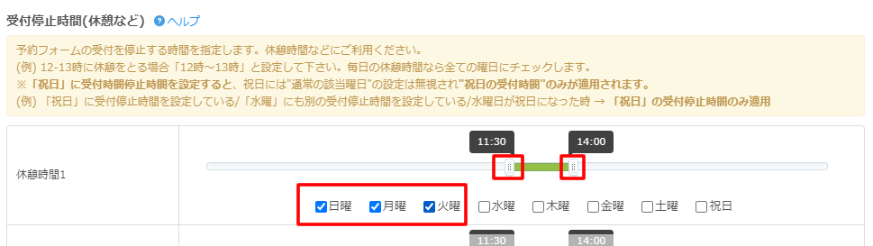 受付時間で指定した時間帯のうち停止したい時間を曜日ごとに設定します。