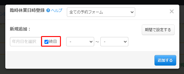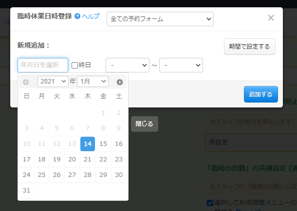 臨時のお休み設定では、指定した日時の予約を停止します。