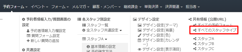 上部メニュー「予約フォーム」⇒「共有情報 (公開URL)/ すべてのスタッフタイプ」をクリックします。