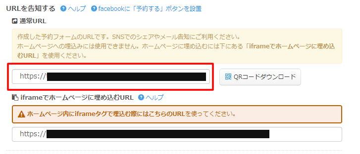「通常URL」に記載のURLが作成した予約フォームのURLです。