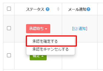 ステータスが「承認待ち」の予約情報は承認待ちボタンをクリックして「確定する」か「キャンセルする」かを指定します。