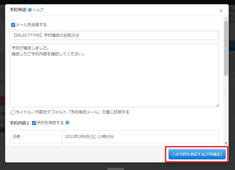 確定するをクリックすると予約承認画面が表示されますので、「この予約を承認する(予約確定)」ボタンより