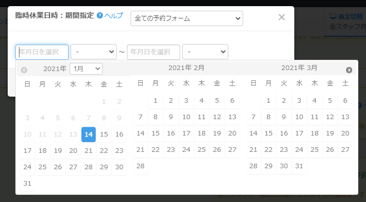 臨時休業日時が設定された日時の受付枠はカレンダー上で非表示になります。