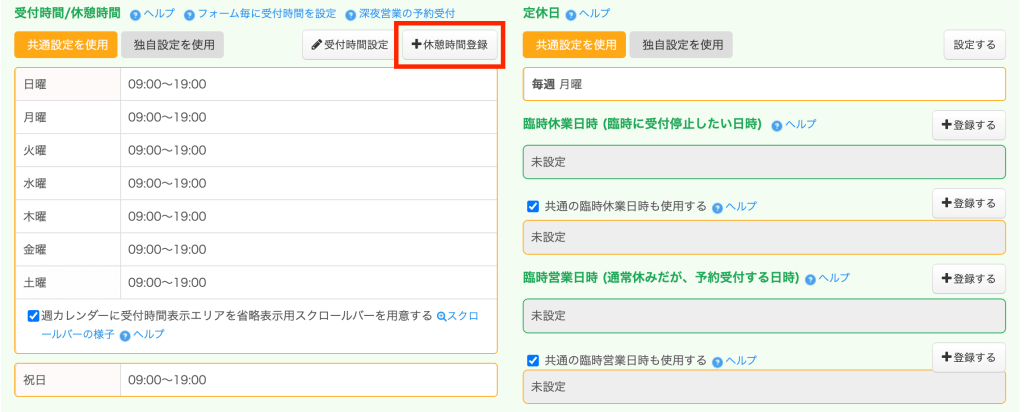 設定方法詳細は「休憩時間の設定方法/営業時間タイプ予約システム」を参照ください。