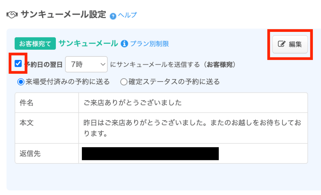 設定方法詳細は、「来店・来場されたお客様にお礼のメールを自動送信する/予約システム」を参照ください。
