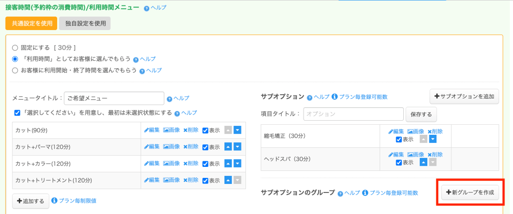 詳細は「利用時間メニューのサブオプションをグループ分けする/営業時間タイプ」を参照ください。