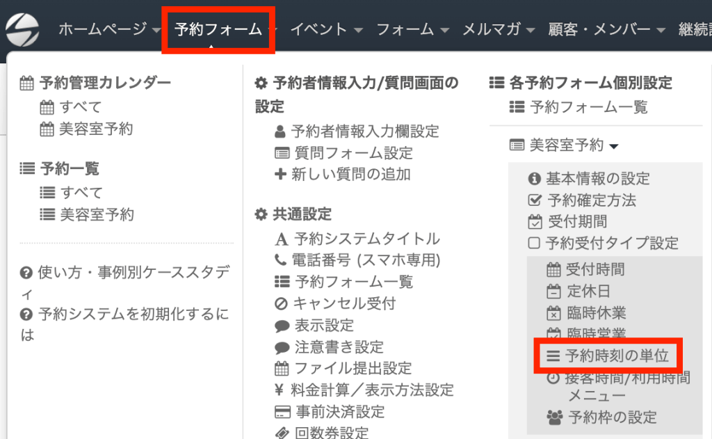 設定を行う場合は、メニューから「予約フォーム」→「予約時刻の単位」をクリックしてください。