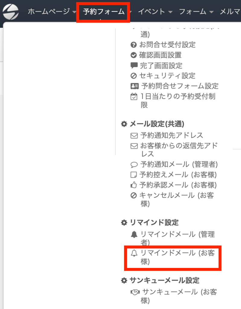 リマインドメールを設定するには、メニューから「予約フォーム」→「リマインドメール(お客様)」をクリックしてください。