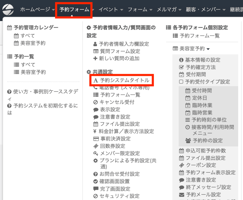 タイトルの変更は、管理ページにログイン後、画面上部メニューの「予約フォーム」→「予約システムタイトル」をクリックすることで設定できます。