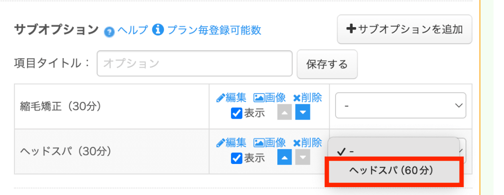 例えば、「ヘッドスパ(30分)」「ヘッドスパ(60分)」など、内容が近いオプションメニューを同じカテゴリとしてまとめておくと、予約画面でも分かりやすくなります。