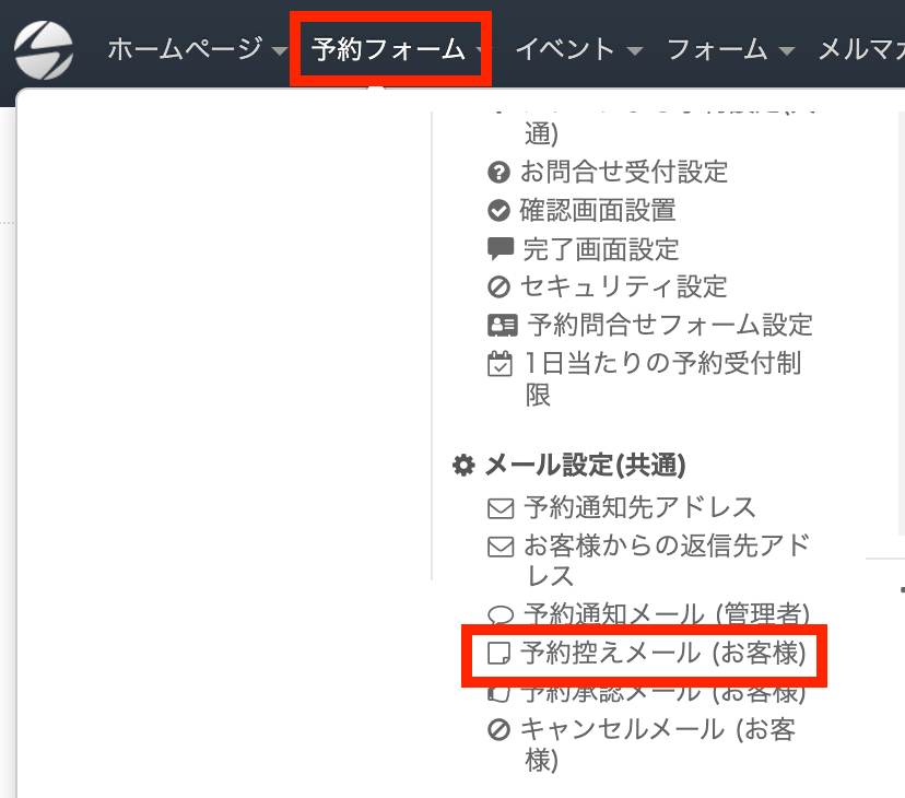 設定方法詳細は「予約フォームで予約をしたお客様に自動送信する「予約控えメール」の設定」を参照ください。