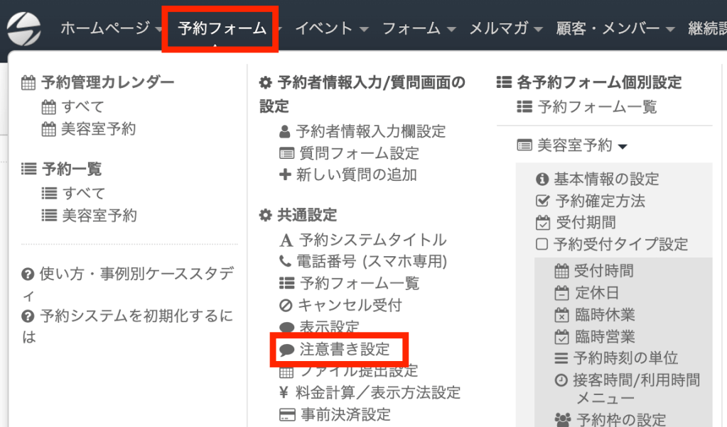 設定を変更するには、管理ページにログイン後、画面上部のメニューから「予約フォーム」→「注意書き設定」をクリックします。