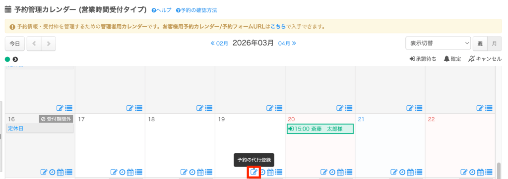 カレンダー画面が表示されたら、予約を登録したい日付の「予約の代行登録」ボタンをクリックし、予約内容を入力して登録します。