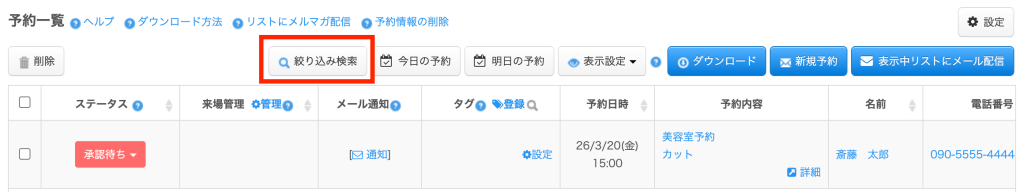 詳細は「特定の情報で予約情報を抽出する/予約一覧の絞り込み検索機能」を参照ください。
