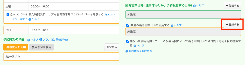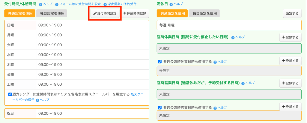 設定方法詳細は「臨時営業日時を受付ける / 営業時間受付タイプ予約フォーム」を参照ください。