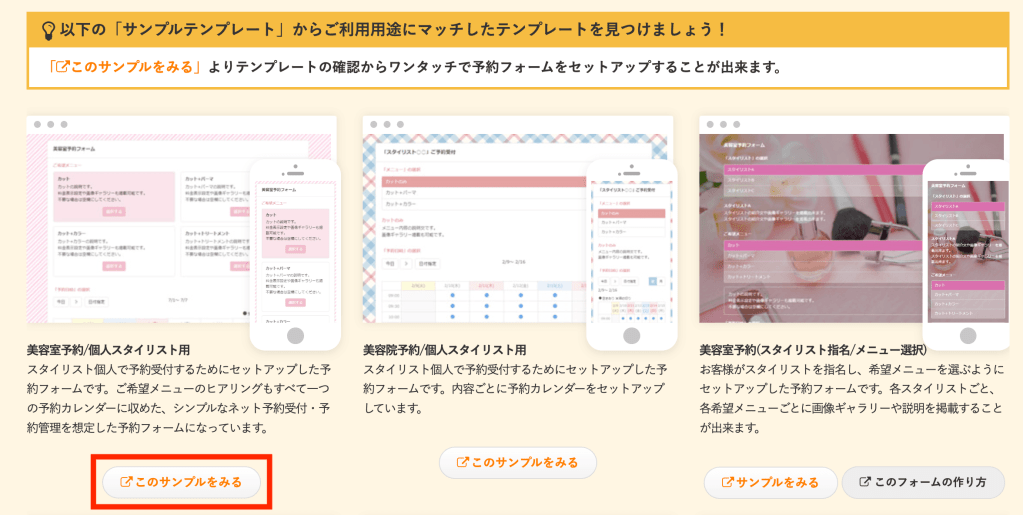 予約システムを公開するには、まず美容室用のテンプレートを選択します。