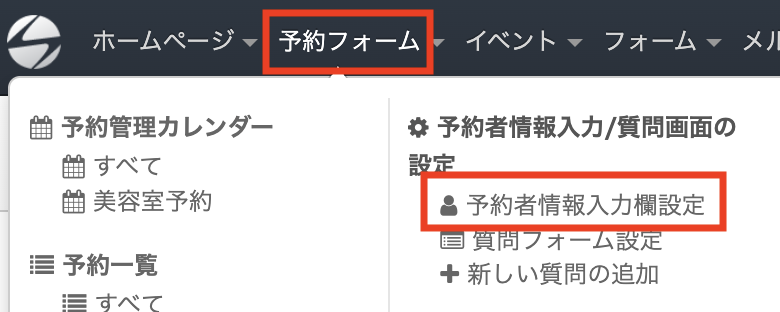 設定を変更するには、「予約フォーム」→「予約者情報入力欄設定」をクリックしてください。